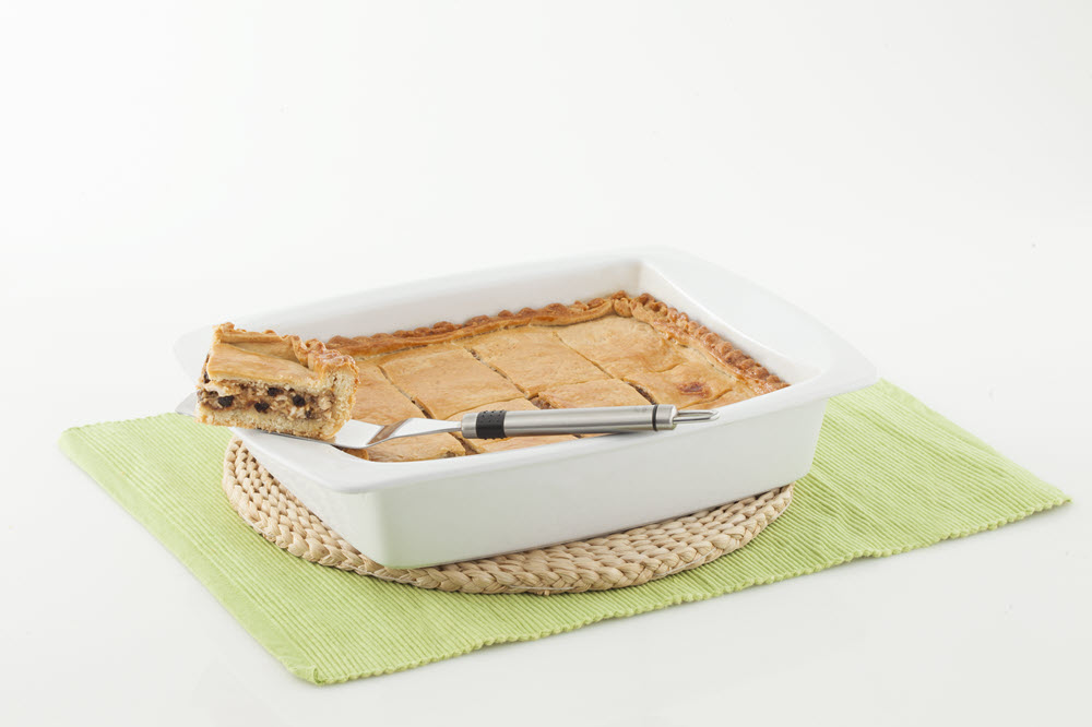 - Ανοίγουμε φύλλο και στρώνουμε το μισό σ’ ένα βουτυρωμένο ταψί. Προσθέτουμε τη γέμιση και κλείνουμε με το υπόλοιπο φύλλο.