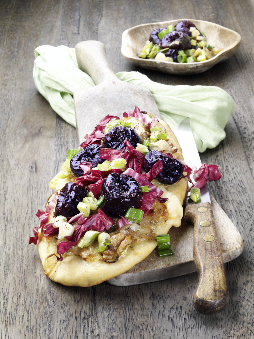 - For the prunes, clean the spring onions and cut them into fine rings. Heat prunes to lukewarm temperature in the stock. Mix in spring onions. Wash radicchio leafs, dab dry and cut into strips. Place on Onion Focaccia Breads and add marinated prunes on top. Serve immediately.