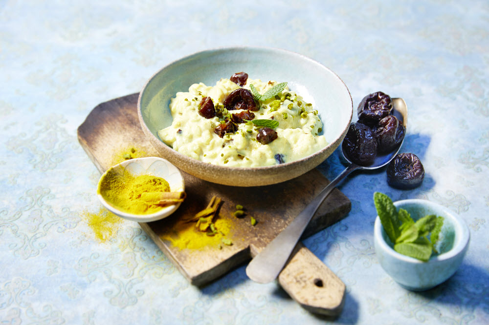 2. Cut prunes into at least 8 pieces. Stir mascarpone and prune pieces into the creamy rice and season with the spices.
