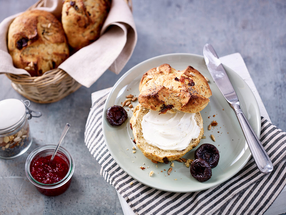 - Chop the almonds and walnuts finely. Cut the remaining prunes into small cubes. Briefly knead the almonds, walnuts, 2 tbsp sunflower seeds, 1 tbsp poppy seeds and prune cubes into the dough. Divide the dough into 10 even pieces, form into rolls and place on a baking tray lined with baking paper. Cut the surface of the rolls crosswise and cover. Leave to rise for approx. 20 minutes.