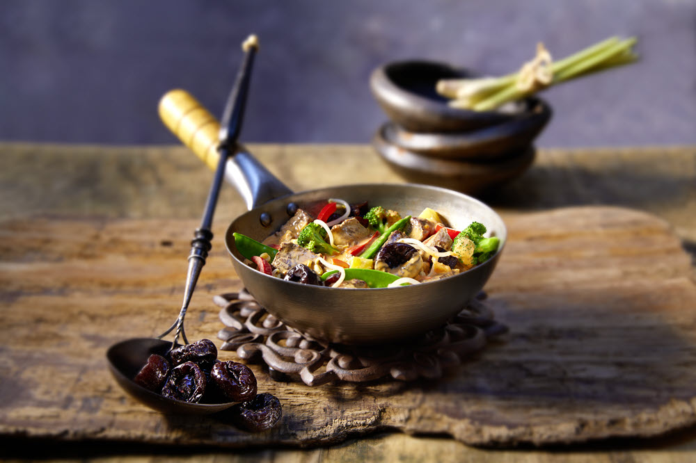 - Add the pineapple and prune pieces and briefly cook them in the wok. Return the meat and other vegetables to the wok. Pour the spicy sauce over the mixture and bring everything to the boil once more, while continuing to stir. Add salt and pepper to taste. Serve immediately.