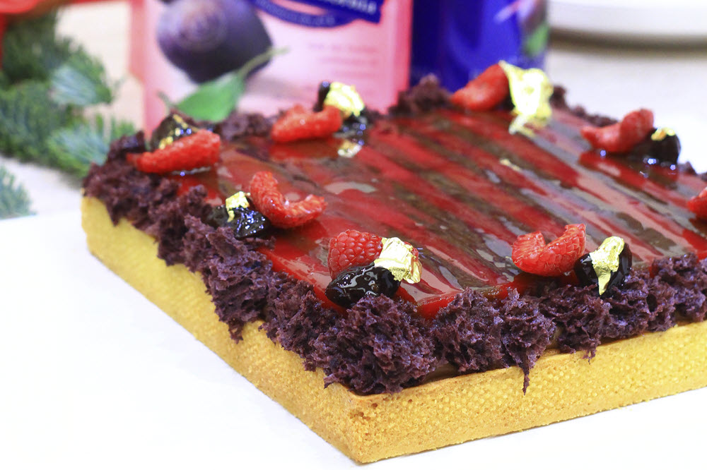 - Una volta che la torta sar’agrave; fredda ricoprire con uno strato di crema al cioccolato di circa un centimetro e decorare con le gel’eacute;e di lamponi e di prugne al vino rosso speziato tagliate a fettine lasciando un centimetro circa lungo tutto il bordo su cui poi andagiare la spugna viola. Lucidare con un velo di gelatina.