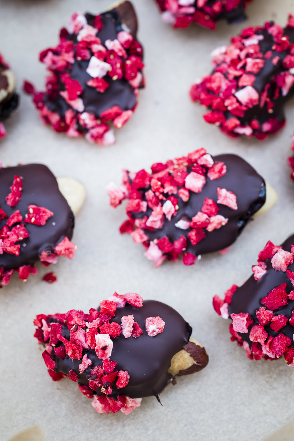 - Tenendole in mano dalla parte della noce del Brasile, immergere le prugne farcite, una alla volta, nel cioccolato e girarle per ricoprirle interamente. Poi ruotolarle nella polvere di fragole disidratate.