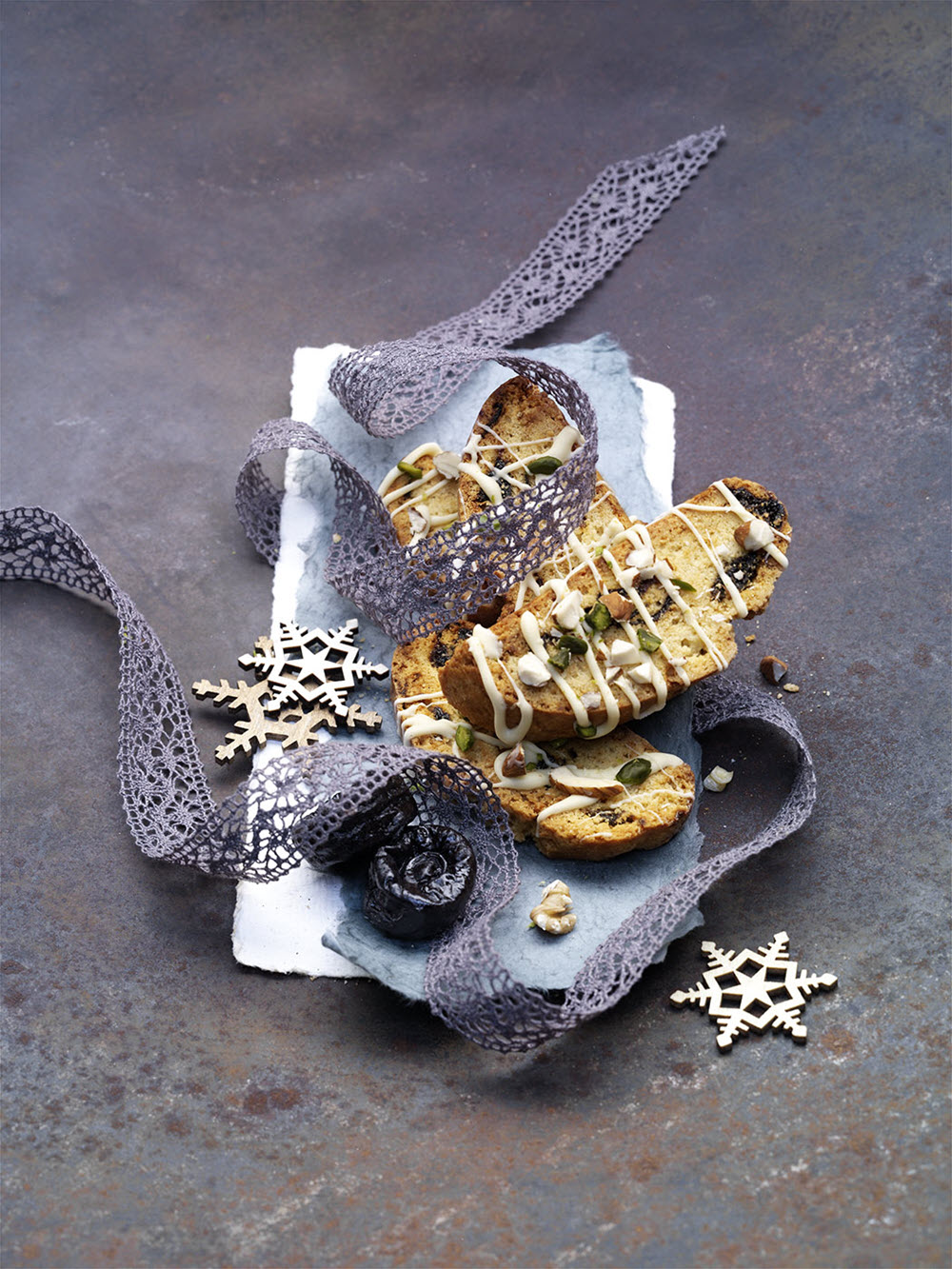 - Togliere i cilindri e tagliarli diagonalmente a fette con un coltello seghettato. Porre le fette sulla griglia, sempre coperta di carta da forno, e cuocere per altri 12 minuti. Girare le fette sull’altro lato e cuocere per altri 8 minuti. Togliere dalla griglia e lasciar raffreddare. Decorare con il cioccolato fuso e la granella di noci e nocciole. Attendere che il cioccolato si solidifichi e incartare come un regalo.