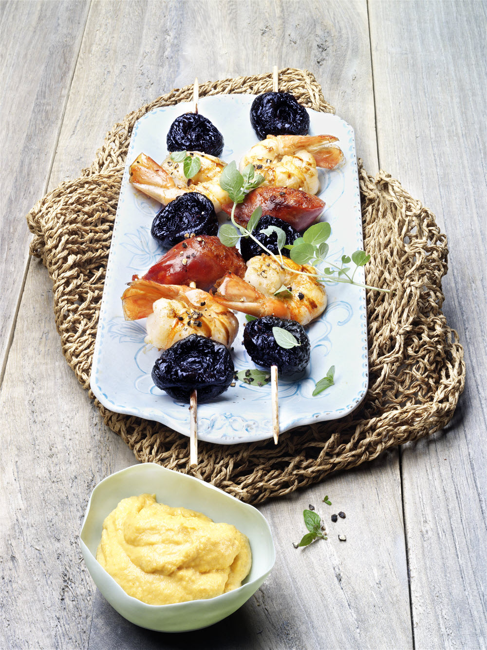 - Mettere a bagno gli stecchini di legno in acqua fredda per 30 minuti, così da evitare che brucino nel grill. Sgusciare i gamberoni lasciando loro la coda. Tagliarli longitudinalmente e rimuovere il filo nero. lavarli, asciugarli tamponando con carta asciuga tutto e condirli con olio EVO. Tagliare la salsiccia in 8 rondelle. Infilare 2 gamberoni, 2 pezzi di salsiccia e 3 prugne su ogni stecchino, alternandoli. Cuocere gli spiedini nel grill o sul barbecue caldissimo per 4-6 minuti. Servire con il dip di patata dolce.
