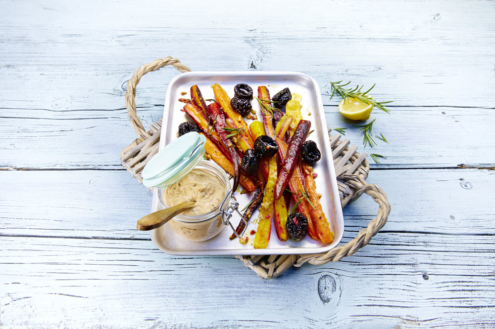 - Pelate le carote e tagliatele a metà per lungo. Sciacquate il limone con acqua calda, grattugiatene la buccia e spremetene il succo. Mescolate bene il succo e la buccia di limone con le carote, l’aglio, l’olio e le prugne. Aggiungete sale e pepe qb.