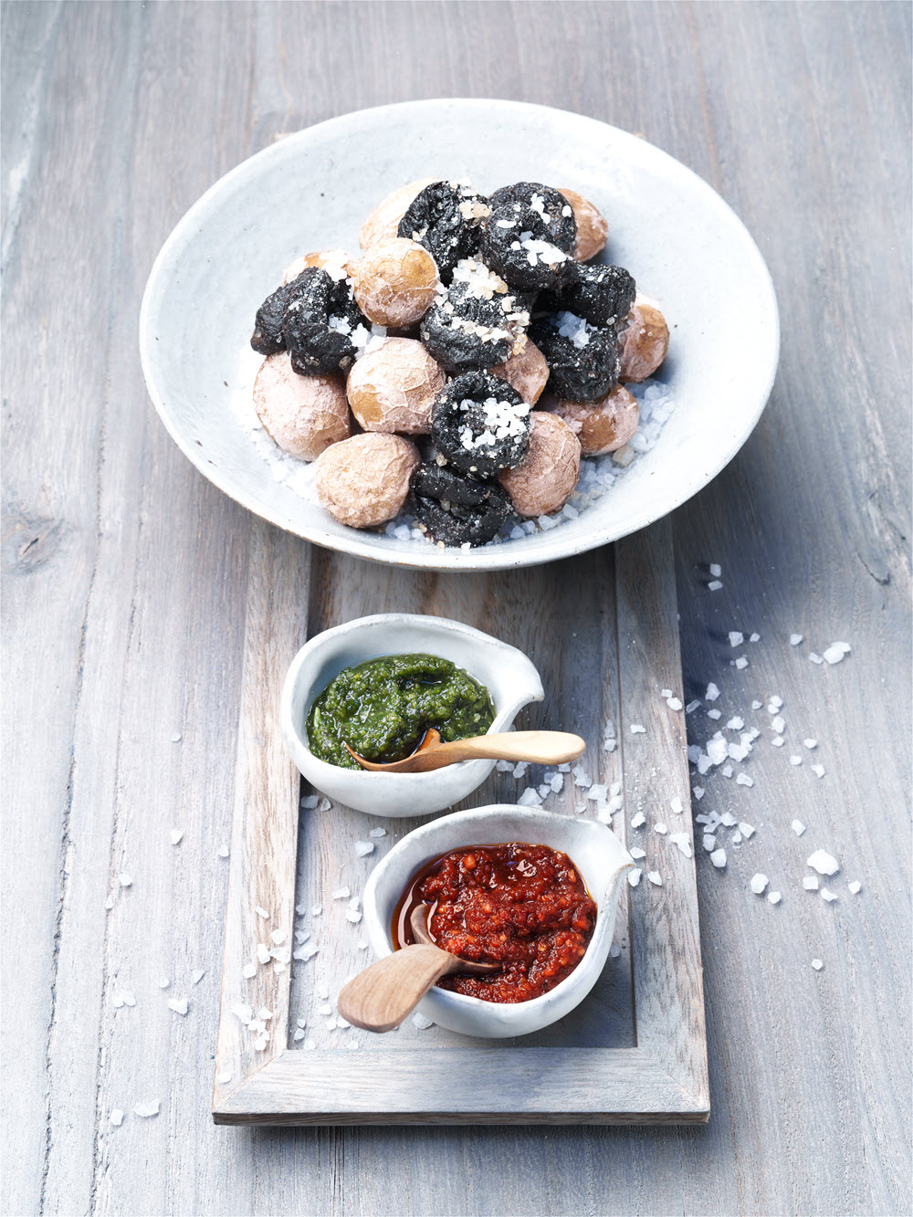 - Vask potetene grundig og legg dem i en gryte. Hell 1 liter vann over og tilsett havsalt. Kok potetene i ca. 20 minutter. Hell av vannet og legg dem tilbake i gryten. Ha i sviskene. Sett gryten tilbake på den varme platen og dekk potetene og sviskene med resten av saltet ved å riste på gryten. Server potetene sammen med mojo-sausen.