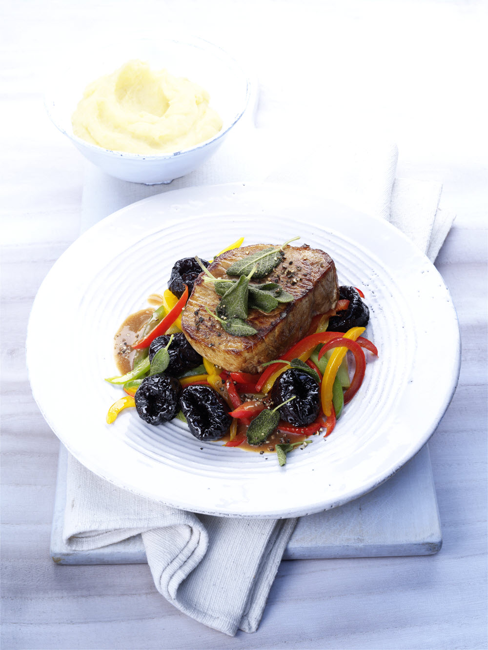 - Anrett koteletter og paprika på en tallerken. Server med potetmos eller kokte poteter.