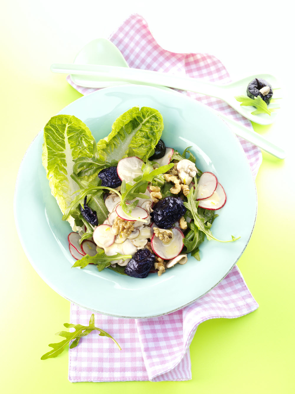 3. Del sviskene i to eller fire. Vask ruccola og rist tørr. Tilsett svisker, valnøtter og ruccola sammen med soppen og bland kort. Legg over salatblad og server.