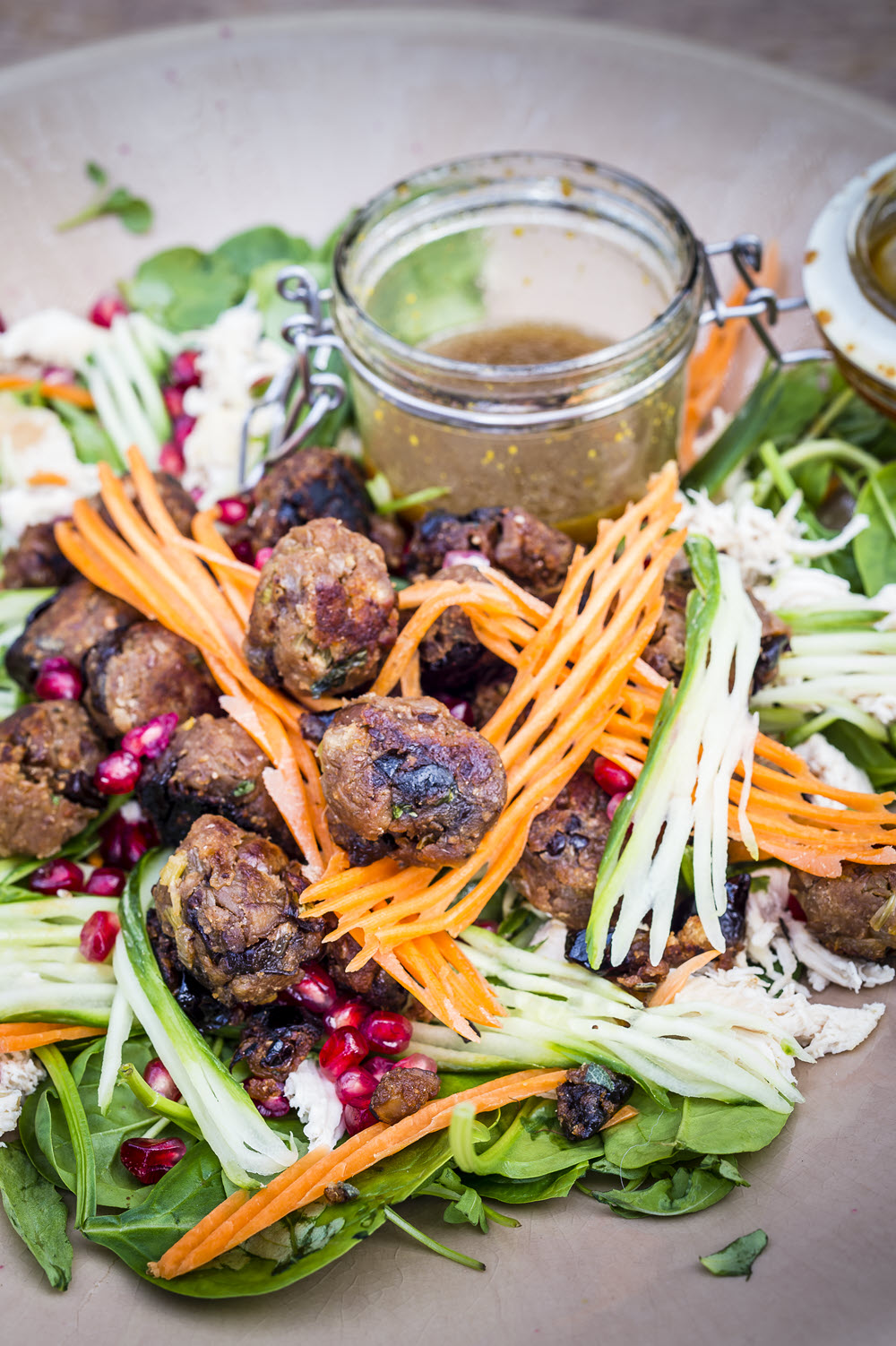 2. Assemble the salad in a large serving bowl: leaves first, then the chicken, the grated carrot and the cucumber, sprinkling in the pomegranate seeds last. Set aside.