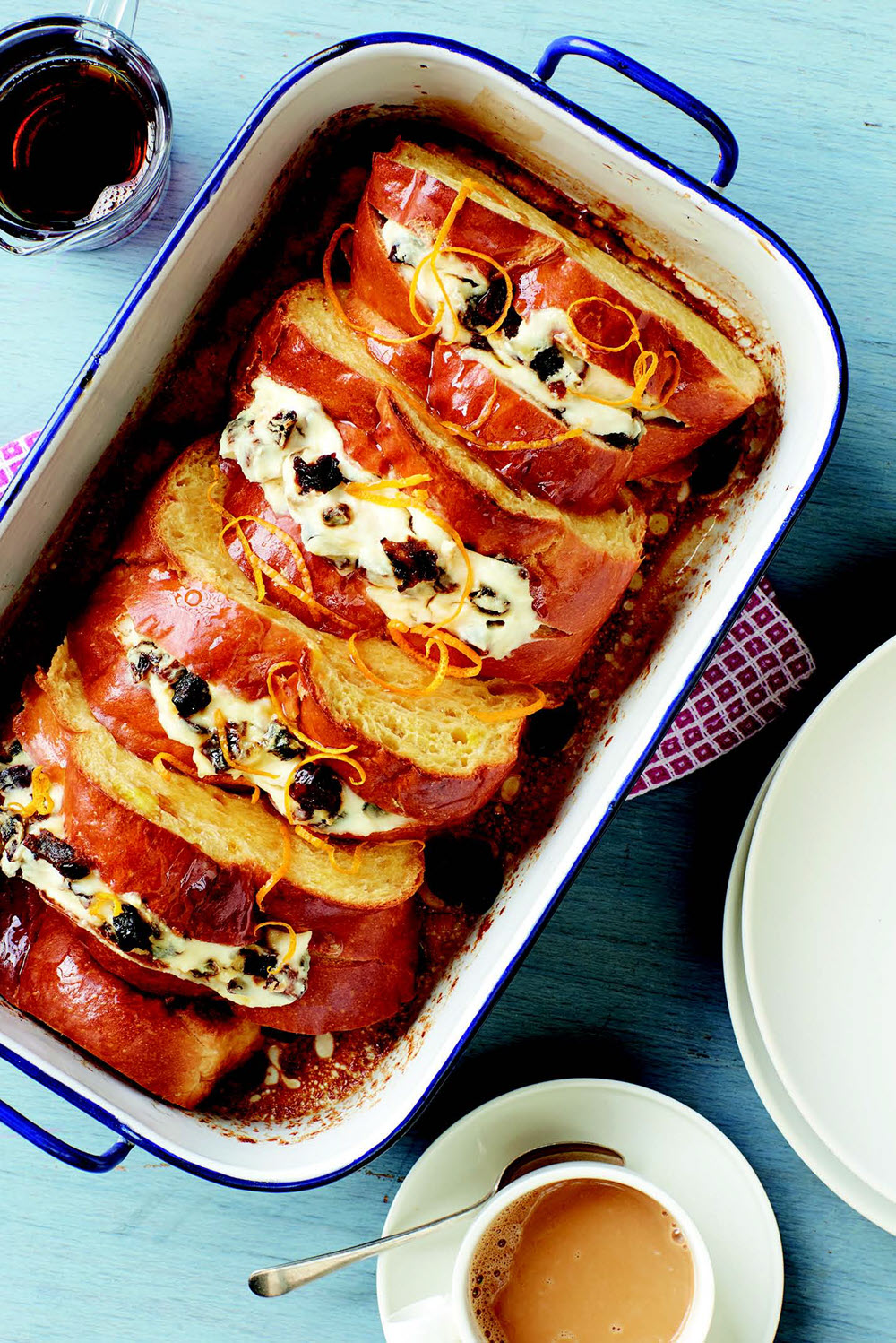- Bake for 30–35 minutes, or until lightly browned. Place onfour plates and sprinkle with icing sugar, chocolate chips and orange zest, if desired.