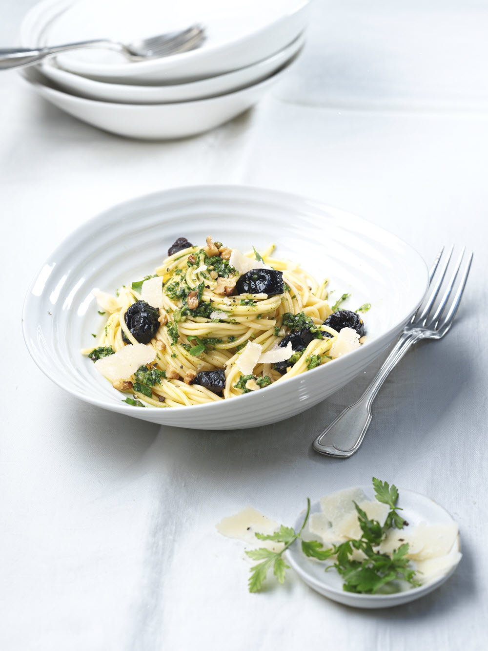 Chopped walnuts add a great touch to creamy pesto paste. Include spinach and California prunes for a spaghetti dish thats perfect for any dinner setting.