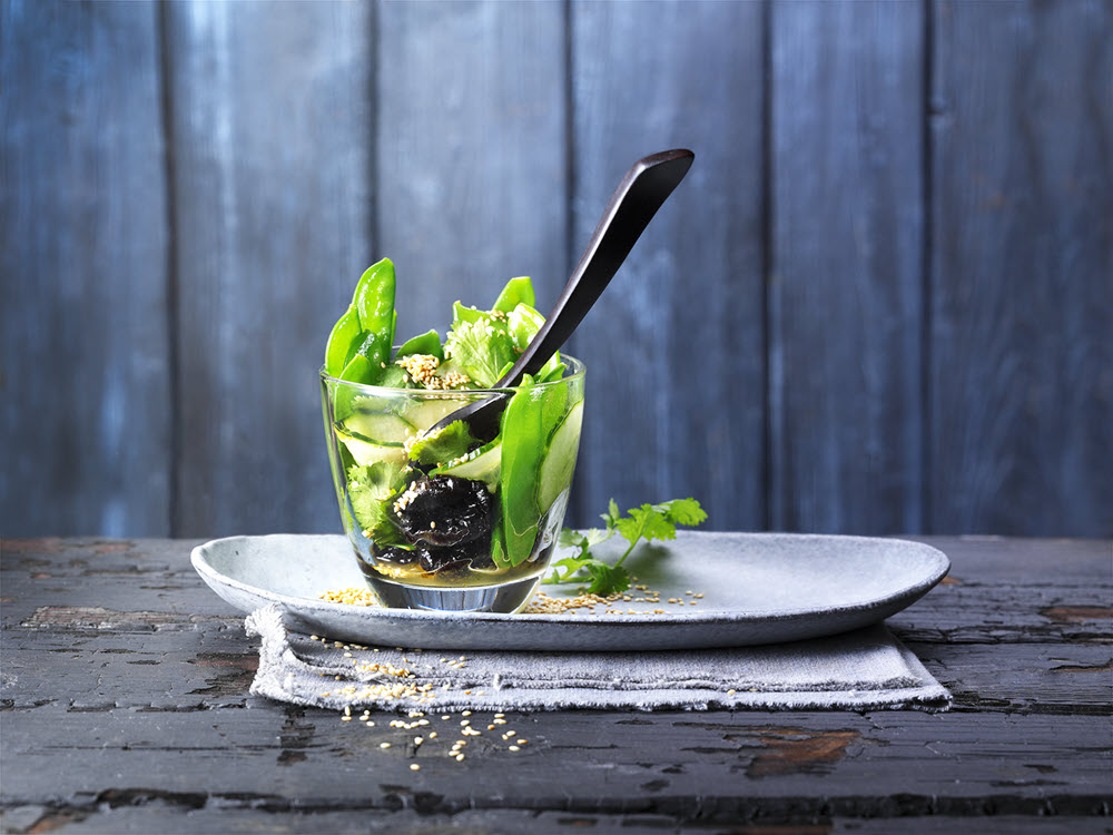 - Combine lime juice, honey, 1 tsp salt, cayenne pepper and sesame oil in a salad bowl. Cut the prunes into quarters. Wash the cucumber and slice thinly. Mix prunes, cucumber and mangetout with the salad dressing, cover and leave to stand for 10 minutes.